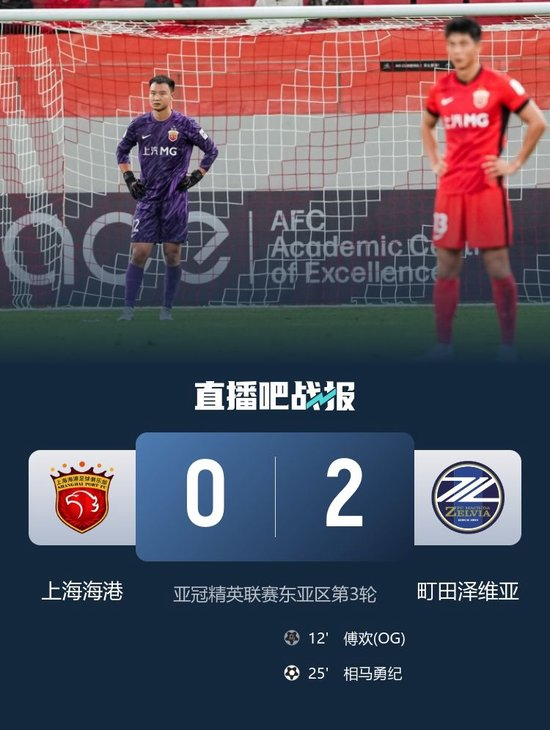 直播吧10月21日讯 北京时间10月21日20:15,亚冠精英联赛东亚区第3轮,上海海港在浦东足球场迎战町田泽维亚。上半场,傅欢不慎自摆乌龙,相马勇纪低射扩大优势,海港0射正;下半场,相马勇纪打入一球但越位在先,双方均未破门。最终,海港0-2不敌町田泽维亚,1平2负仍排在东亚区最后一位,町田泽维亚积5分升至第3位。